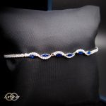 المان برجسته این دستبند، استفاده از نگین‌های آبی رنگ با تراش مارکیز (navette) است که در کنار خطوط منحنی از نگین‌های ریز سفید (زیرکونیا) قرار گرفته‌اند. این چینش خاص باعث شده تا دستبند جلوه‌ای چشم‌نواز داشته باشد و در نور به زیبایی بدرخشد. طراحی ریورا هم برای مجالس رسمی و هم برای استفاده روزمره، گزینه‌ای فوق‌العاده است.