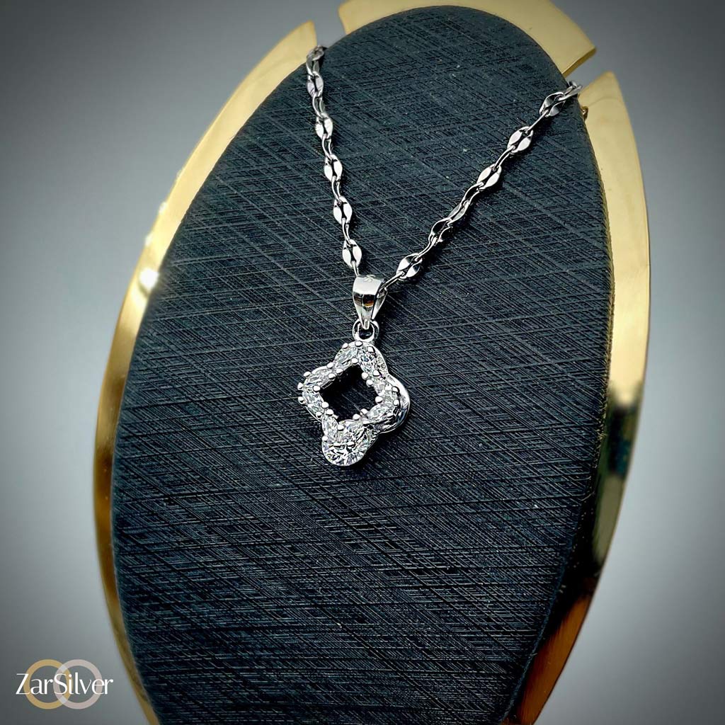 مدال کوچک و مربعیشکل این گردنبند، با دقت بالا و جزئیات ظریف ساخته شده است. ترکیب براقیت نقره با روکش رودیوم، نه تنها زیبایی چشمنوازی ایجاد کرده، بلکه باعث شده تا گردنبند در برابر تغییر رنگ و کدر شدن مقاوم باشد.